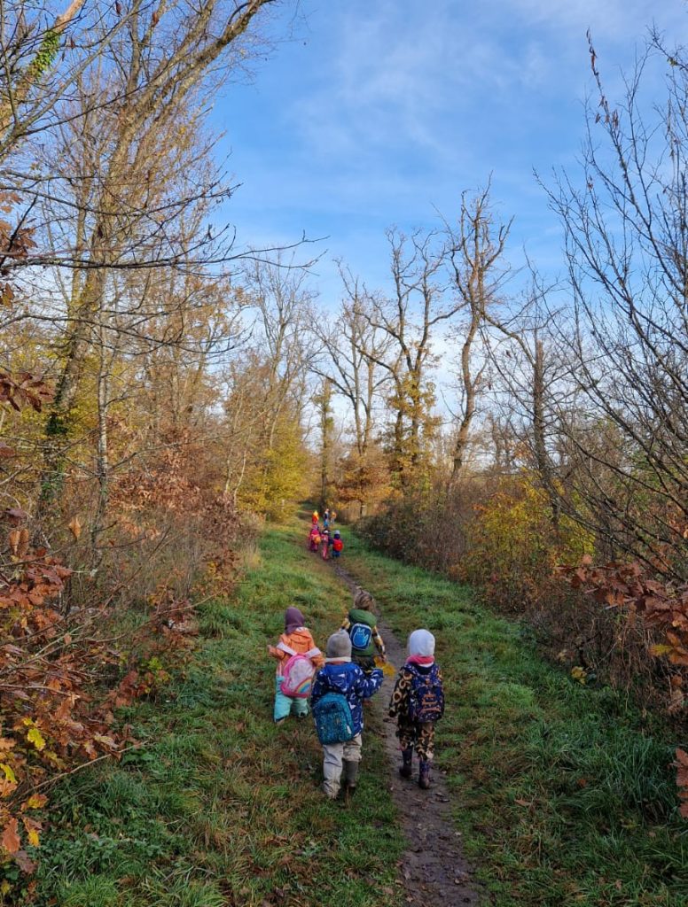 • Nous portons une attention particulière, au quotidien à être en contact avec la nature, au fil des saisons et en lien avec le vivant. (Nous avons des animaux au sein de l’établissement et réalisons une promenade en forêt hebdomadaire. La forêt se situe à 5 minutes à pied de l’école.)