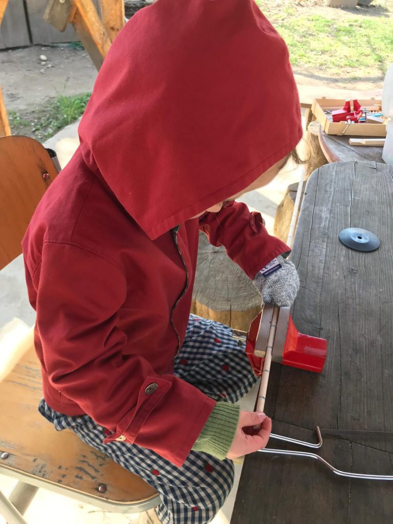 Les travaux des grands ont lieu plusieurs fois par semaine à partir du milieu de l’année. C’est un moment de rassemblement et de cohésion entre les enfants qui rejoindront l’école primaire l’année scolaire suivante. C’est un temps spécifique où la jardinière les aide à mener différents projets comme la réalisation d’un métier à tisser et d’une création à partir de son tissage ou bien encore un spectacle de marionnettes avec une représentation. C’est un temps où les activités sont adaptées à leur âge et qui les accompagne vers une maturité.